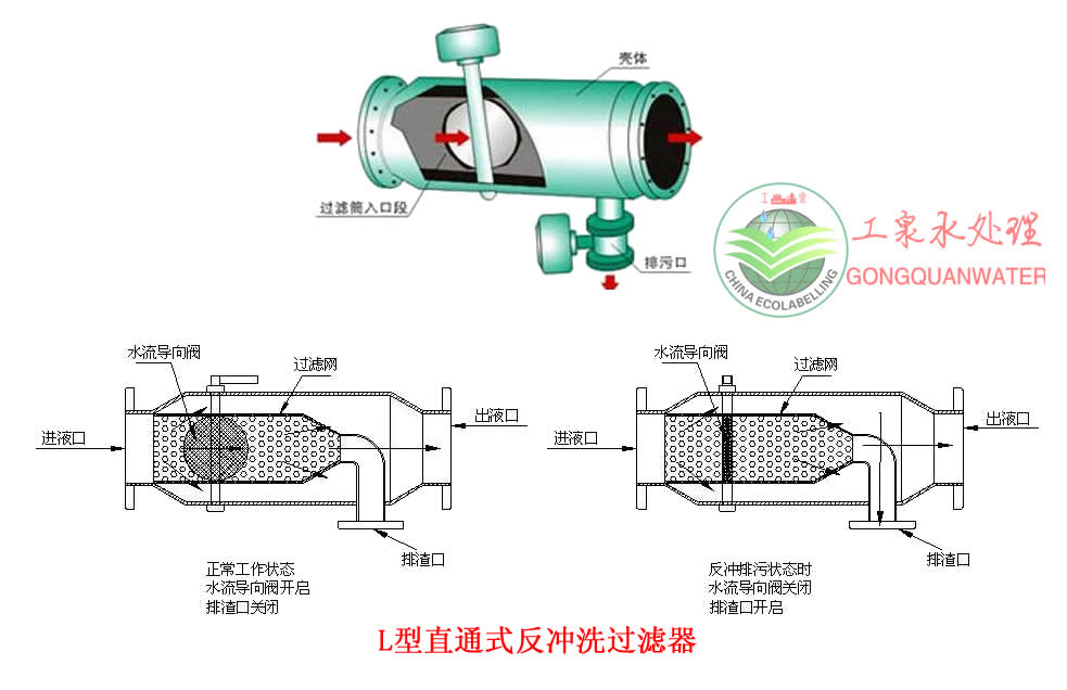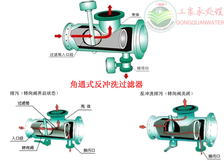 反沖洗過濾器分為直通式與角通式,有手動反洗與自動反洗兩種。全自動反沖洗過濾器需要排污時,關閉蝶閥,打開排污閥,水流經濾網前半段過濾,部分水流有出口流入系統,剩余水流由濾網后半段外側流入內側,經排污口排出,起到反向自動沖洗濾網的作用。整個沖洗過程系統可正常工作,無需停機。