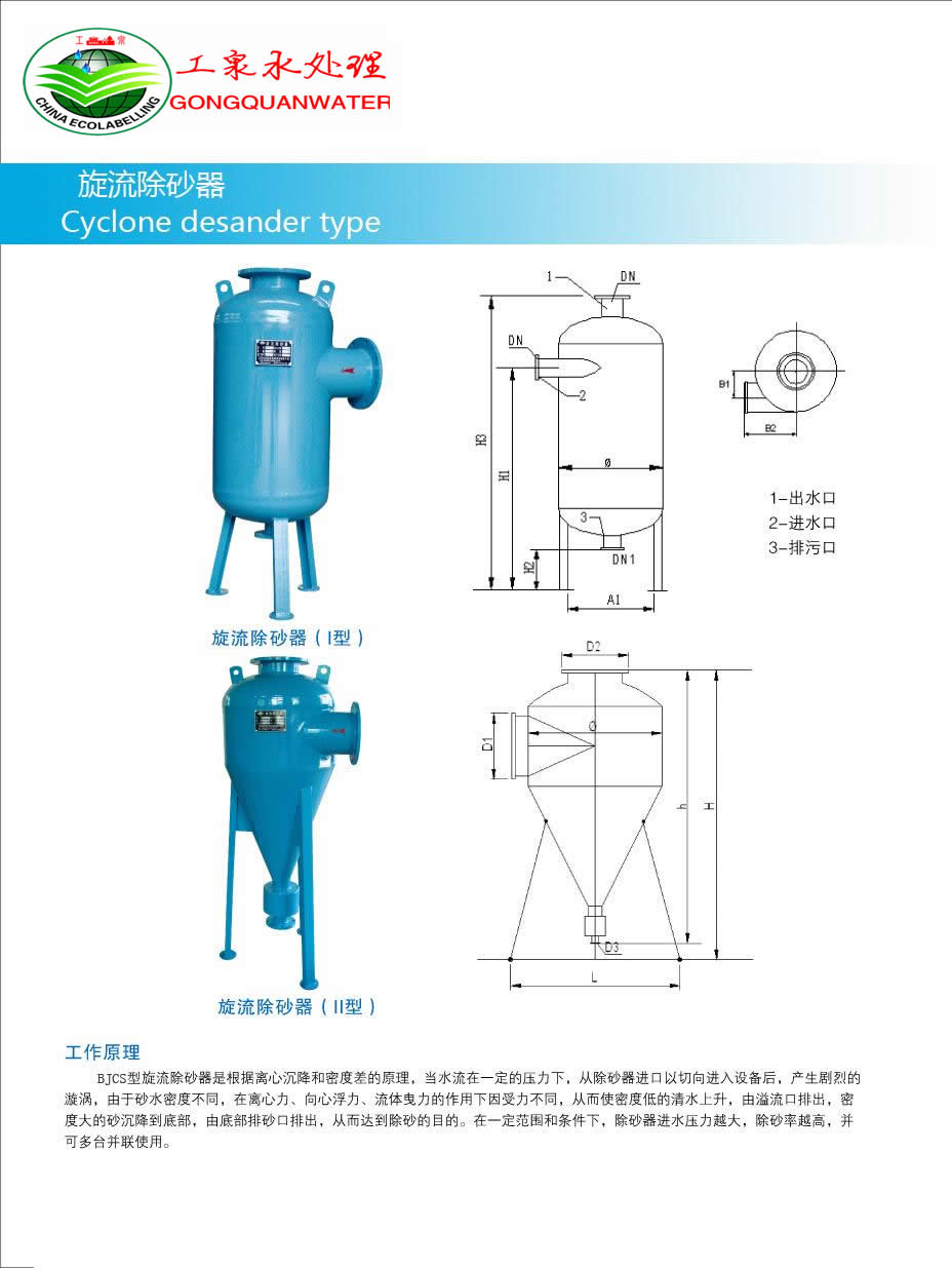 旋流除砂器的工作原理: 旋流除沙器是利用離心分離的原理進行除沙,由于進水管安裝在筒體的偏心位置,當水通過旋流除沙器進水管后,首先沿筒體的周圍切線方向形成斜向下的周圍流體,水流旋轉著向下推移,當水流達到錐體某部位后,轉而沿筒體軸心向上旋轉,最后經出水管排出,雜污在流體慣性離心力和自身重力作用下,沿錐體壁面落入設備下部錐形渣斗中,錐體下部設有構件防止雜物向上泛起,當積累在渣斗中的雜物到一定程度時,只要開啟手動蝶閥,雜物即可在水流作用下流出旋流除沙器。 旋流除砂器是根據離心沉降和密度差的原理,當水流在一定的壓力下從除砂進水口以切向進入設備后,產生強烈的旋轉運動,由于砂和水密度不同,在離心力、向心力、浮力和流體曳力的共同作用下,使密度低的水上升,由出水口排出,密度大的砂粒由設備底部的排污口排出,從而達到除砂的目的。